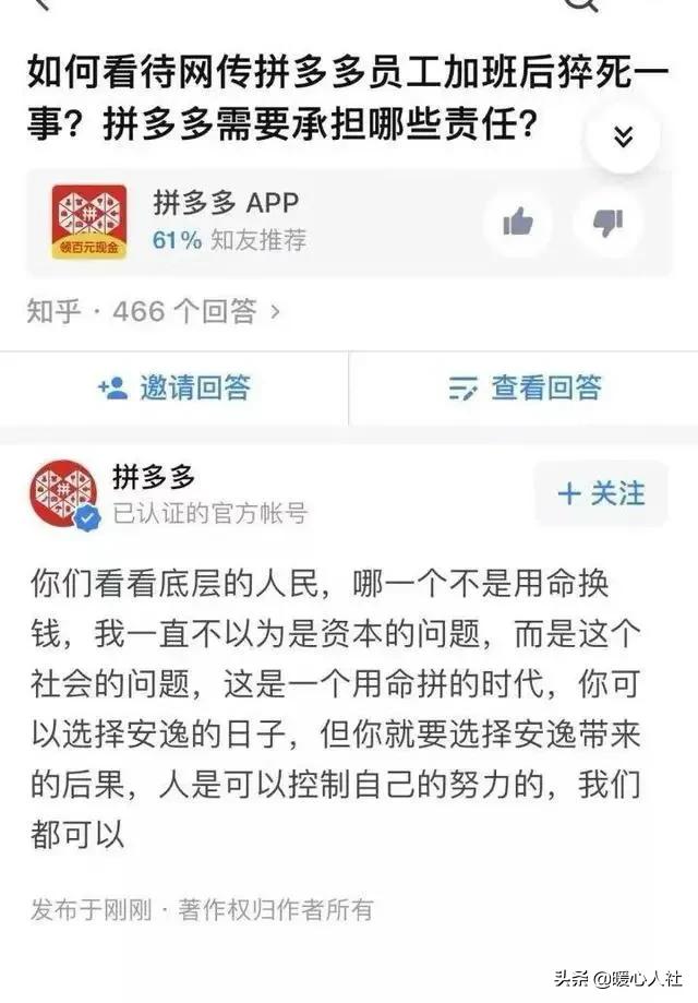 拼多多员工加班猝死,怎么看待拼多多回复底层人民就该拿命换钱?