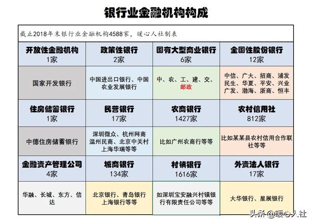 截至2018年末,银行业金融机构总共4588家,除了我们最熟悉的中农工建交邮政六大国有商业银行以外,数量最多的实际上是农商银行和农村信用社,还有一类就是村镇银行,村镇银行共有1616家。