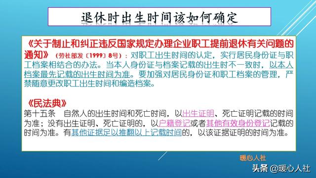 按照1999年《关于制止和纠正违反国家规定办理企业职工提前退休有关问题的通知》,对于职工出生时间的认定,实行居民身份证和职工档案相结合的办法。当本人身份证与档案年龄记载不一致时,以本人档案最先记载的出生时间为准。给大家补充一个知识,我国的《身份证条例》是1985年9月才开始实施,我们使用职工档案核定退休年龄的时间要早得多,可以说从建国初就开始了。