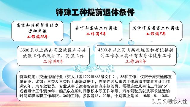 根据1999年《关于制止和纠正违反国家规定办理企业职工提前退休有关问题的通知》,明确高空和特别繁重体力劳动需要工作满10年;井下和高、低温工作,以及3500米以上4500米以下高山高原地区工作,需要从事该类工作岗位满9年;其他有毒有害工作岗位、4500米以上高山高原地区工作以及有核辐射的工作,需要从事该类工作岗位满8年。