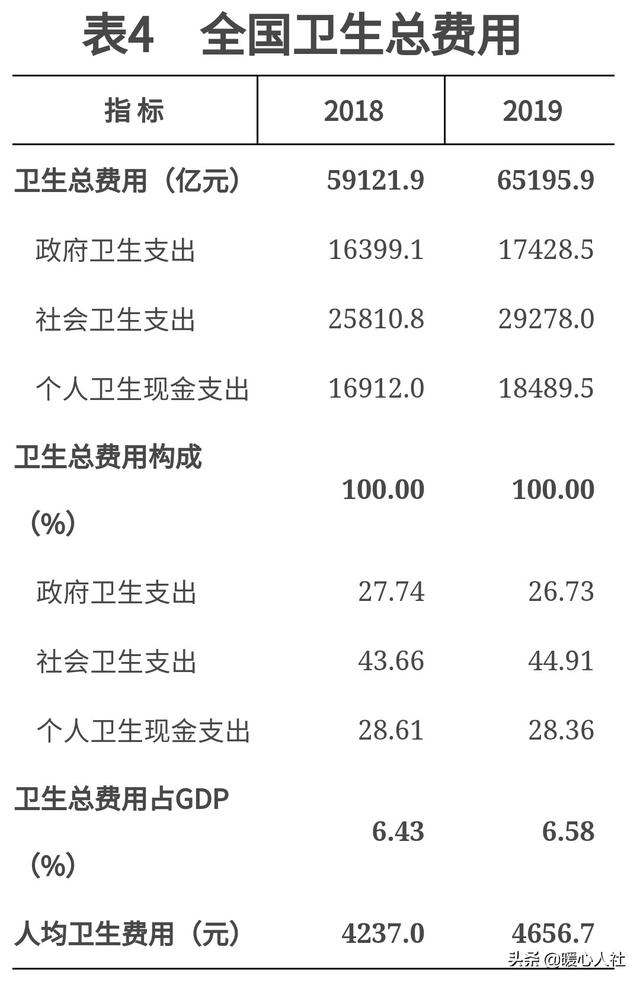 如果说,这些钱都是由大家个人承担,共需要花多少钱呢?根据《2019年我国卫生健康事业发展统计公报》,2019年全国卫生总费用预计达65195.9亿元,占整个GDP的6.58%人均4656.7元。实际上,个人卫生现金支出是18489.5亿元,约占总支出的28.36%。
