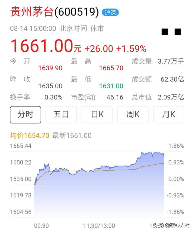 截至8月14日收盘,贵州茅台的股价达到了1661元,总市值超过了2.09亿元,折合美元3000亿元。