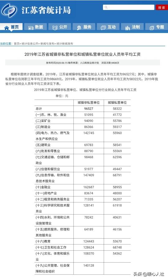 2019年,按照江苏省统计局公布的信息,江苏省城镇非私营单位就业人员年平均工资为96527元,平均每月8044元,增长了接近1000元,涨幅14%。其中,城镇非私营单位在岗职工年平均工资为98669元,平均每月8223元,增长了妥妥的1000元。