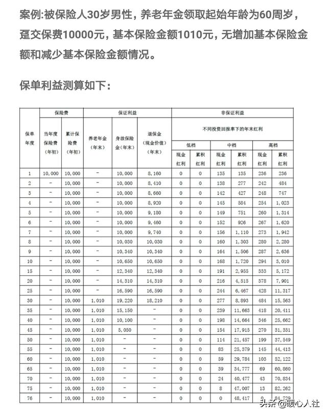 商业保险商业保险,比如某宝的全民养老金。根据其利率演示,30岁一次性缴纳1万元,60岁开始每年领取1010元,不是55岁开始领养老金。不过,另外还会有一定的不定红利。如果是65,000元,未来每年养老金6565元,相当于每月550元左右的养老金。而且还得30岁就一次性缴上完成资本积累,未来才能领取这样高的养老金。
