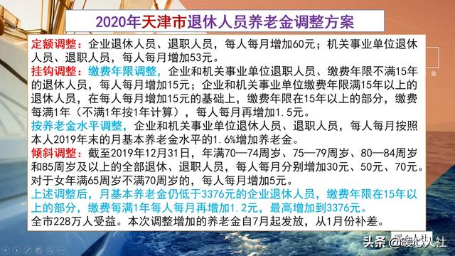 倾斜调整部分,有一条体现天津地方个性化的倾斜政策,即养老金低于人均水平人员,缴费年限超过15年的,有额外倾斜性照顾。