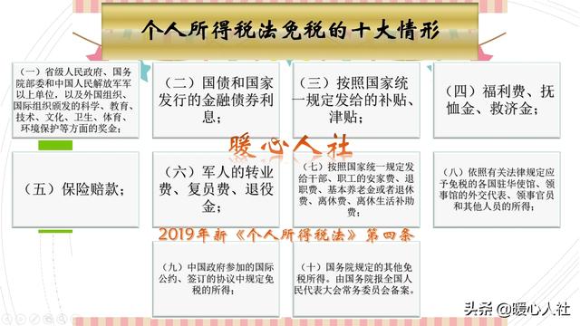 按照《个人所得税法》的规定,个人所得税的免除有十大类情形。主要包括: