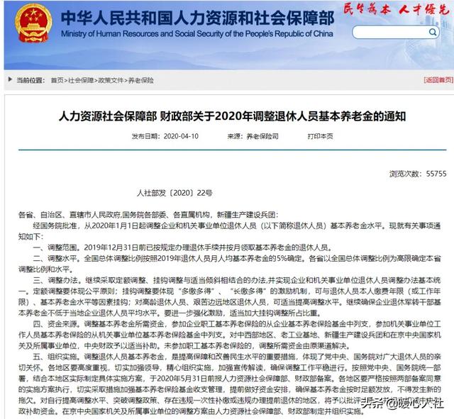 4月10日,人社部、财政部公布了2020年调整退休人员基本养老金的通知。根据通知的要求,从2020年1月1日起,对2019年12月31日之前办理退休并领取了退休待遇的人调整养老金。