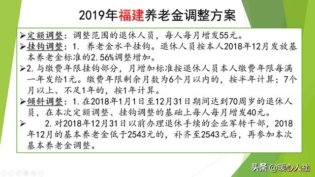 2019年养老金调整方案:定额调整,每人每月增发55元;按基本养老金比例调整2.56%;缴费年限调整每年增加一元。对于上一年度内到达70岁的退休老人,在定额调整、挂钩调整基础之上,每人每月增发40元。对于企业军转干部,养老金调整后水平不低于2543元。