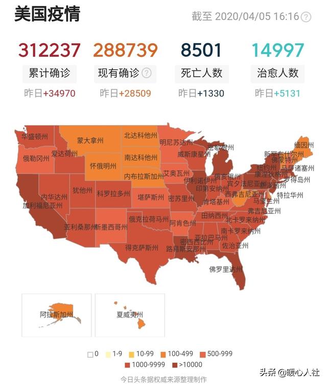 截止到北京时间4月5日,美国累计确诊新冠肺炎感染者311301例,较前一日新增34970例,创新高;累计死亡8476例,较前一日新增1330例,也创新高;累计治愈14694例,较前一日新增5131例,也是新高!