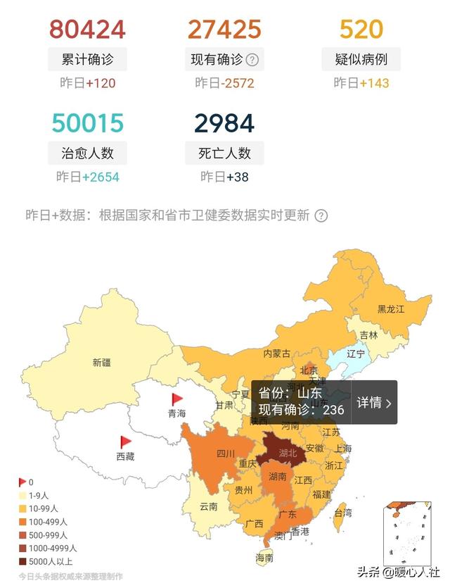 3月3日,我国新增确诊病例120例,湖北省除武汉以外其他地区仅新增一例,疑似人数仅有520人。现在大量新冠肺炎治愈者出院,医院还有确诊人数27425人,已经不足高峰时的一半。全国各省市调动4.2万名医护人员支援湖北、支援武汉,我国的新冠肺炎疫情已经出现了彻底好转。