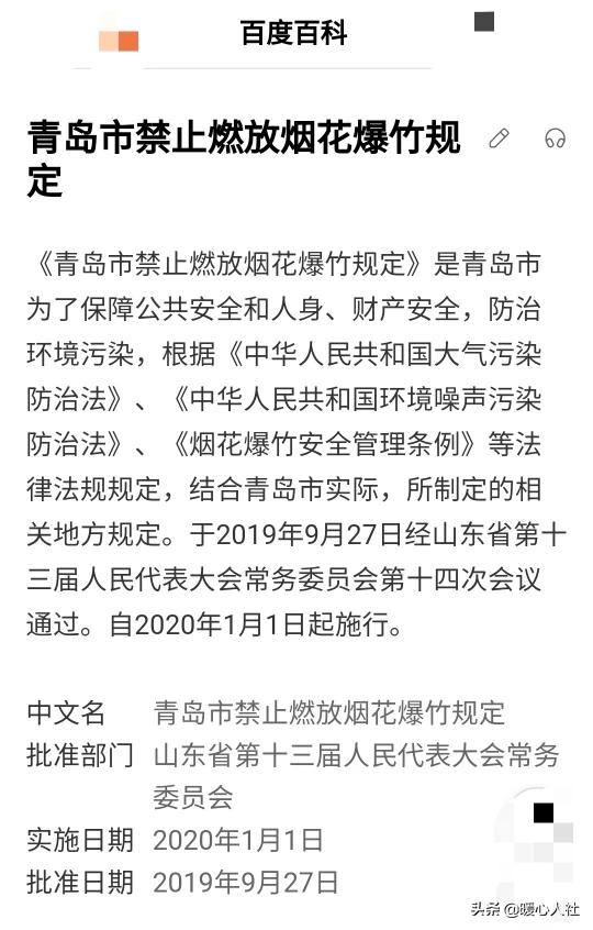 2020年,全国很多地区都出台了,禁止燃放烟花爆竹的规定。比如青岛市禁止燃放烟花爆竹,规定是2019年9月27日通过,2020年1月1日实施。上级法律依据是国家的《大气污染防治法》、《环境噪音污染防治法》、《烟花爆竹安全管理条例》。