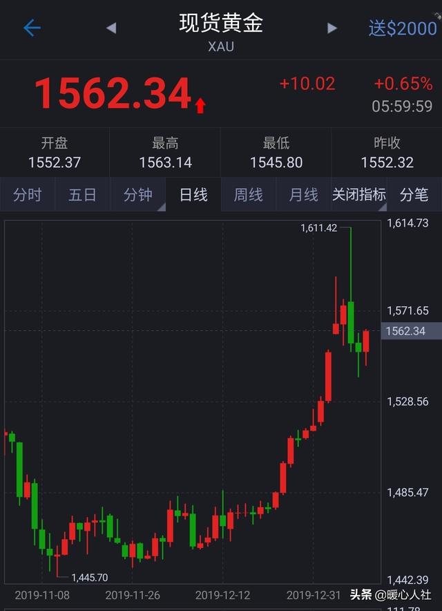 比如说战争、国际地区趋势的紧张。这一次美国和伊朗的问题就是如此。发生冲突以后,根据双方的博弈,局势迅速缓和下来。黄金价格有1530美元左右,迅速冲高至1611美元,紧接着随着局势缓和价格跌回到了1560美元左右。