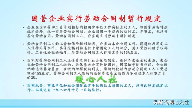 值得注意的是国有固定工人和劳动合同制工人的区别。根据1986年10月国家《国营企业实行劳动合同制暂行规定》,1986年10月以后新入职的人员要实施劳动合同制,缴纳退休养老基金。因此,对于这些固定工人一般都是1986年10月以前入职的人员。