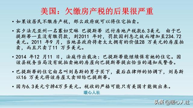 一旦房地产税征收,后果真的很严重。像美国,如果居民不缴纳房产税,政府可以将住宅拍卖。宾夕法尼亚州的一名寡妇,由于迟付房地产税款6.3美元,导致房子被拍卖,虽然最终又买了回来,但是亏掉了4万多美元。有人说在美国,只有死亡和税收是无法避免的。