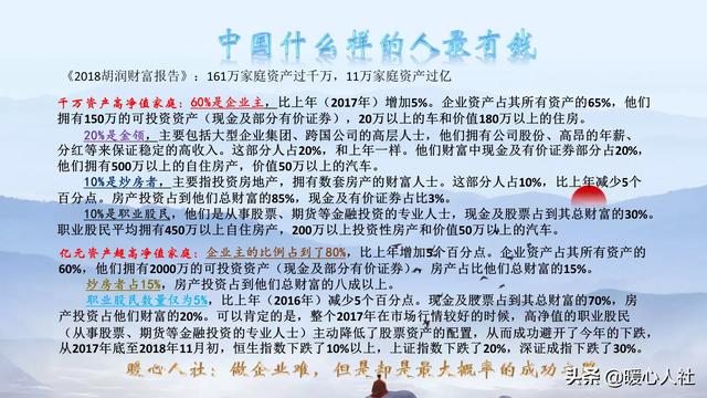 中国亿万富豪的数量,根据《2018胡润财富报告》显示,大约有11万户家庭。其中,80%的家庭属于企业主,15%的是炒房者或者房产拥有者,只有5%属于职业股民。所以,要想致富还得干企业才可以。