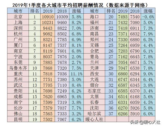 比如根据网络某平台公布的2019年一季度各大城市平均招聘薪酬显示,北京,上海,深圳,杭州,广州,南京,厦门,宁波等8个地区平均招聘薪酬超过了8000元。