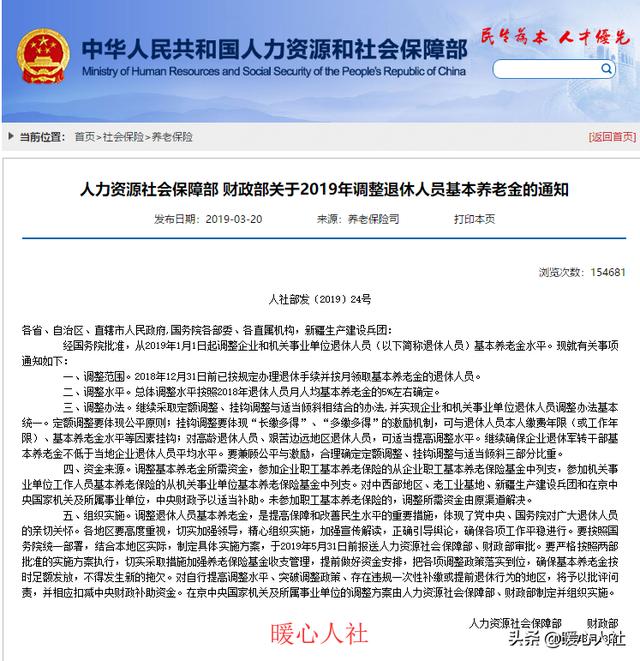 2019年3月20日,人社部公布了2019年关于退休人员基本养老金调整的通知。明确对2018年12月31日之前办理了退休手续,并领取了退休待遇的人进行养老金调整。