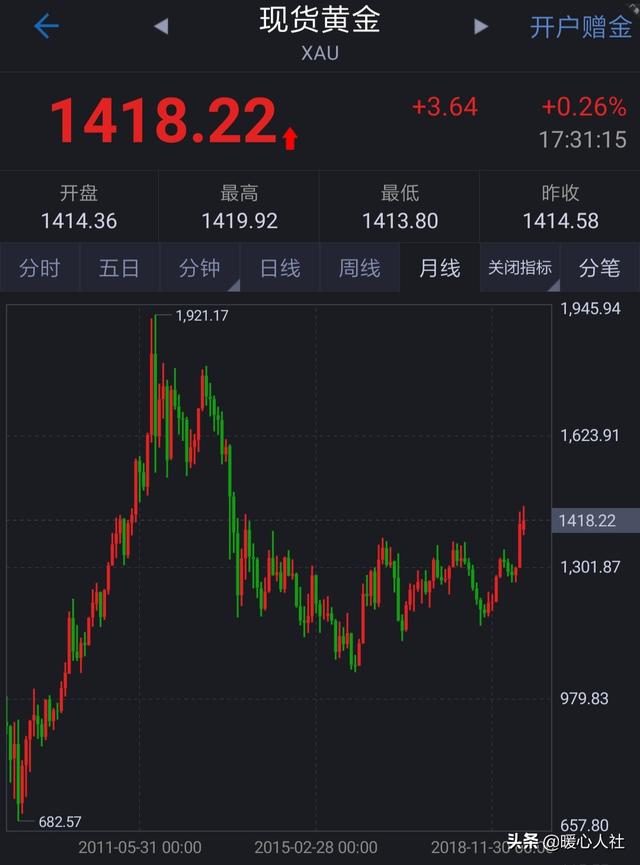 过去几年的黄金最低点是2015年12月份,黄金跌到了1046美元的低谷。