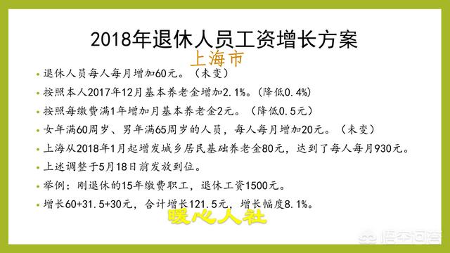 二、题主2018年2月退休,你虽然享受不到2018年退休人员上调养老金的待遇,但也可以享受到养老金的重新核算,并有养老金增加。为什么呢?在退休人员养老金的计算时,有一个数据叫全省(市)上年度社平工资。这个上年度社平工资一般要在下半年才能公布。比如题主2018年2月退休,计算你退休金的上年度(2017年)的社平工资要在2018年的7、8月才会公布。为了能让你按时领取到退休金,社保部门的工作人员会先用你退休时上上年度,即2016年上海市的社平工资为你计算养老金,等到7、8月份上年度,即2017年的社平工资公布后再重新帮你计算正式的养老金,并按照新的养老金标准对你3月份以来这几个月的养老金进行补差。