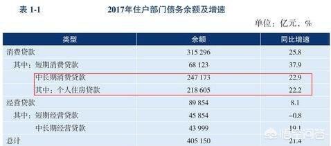 比如2017年住户部门债务余额。消费贷款总额是31.5296万亿元,中长期消费贷款是24.7万亿元,其中个人住房贷款是21.86万亿元。