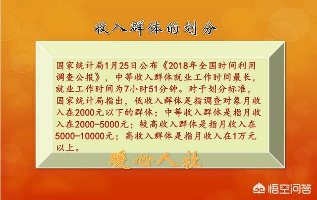 有人认为这是在开玩笑,其实我是认真的。按照国家统计局2019年1月25日公布的《2018年全国时间利用调查公报》显示,中等收入群体是指月收入在2000~5000元的群体。较高收入群体则是职业收入在5000到1万元的群体。当收入低于2000元才算低收入群体。