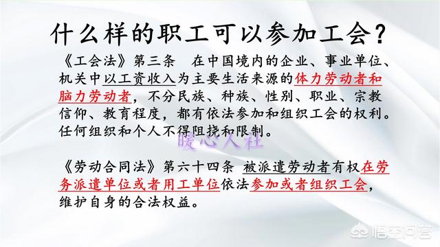 首先,我们看一下《工会法》第三条,在中国境内的企事业单位、机关中以工资收入为主要生活来源的体力劳动者和脑力劳动者,不分民族、种族、性别、职业、宗教、信仰、教育程度,都有依法参加和组织工会的权利,任何组织和个人不得组织和限制。