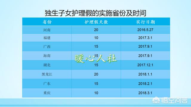 第六,独生子女护理假,国家对独生子女家庭新推出的一种带薪看护假。各省市不同,一般有10到20天。