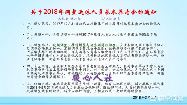 3月23日,人社部就公布了全国关于2018年退休人员基本养老金调整的通知。通知要求,对2017年12月31日前办理了退休并领取了退休待遇的人调整退休养老金。调整的幅度按照2017年人均养老金水平的5%进行调整。