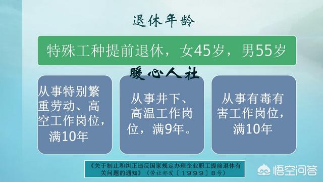 特殊工种是指国家规定,全民所有制企业也就是国有集体企业,从事符合国家规定的,重体力劳动、高空、井下、高温作业岗位,以及有毒有害的工作。满足相应年限,可以提前五年退休。女职工是45岁,男职工55岁退休。