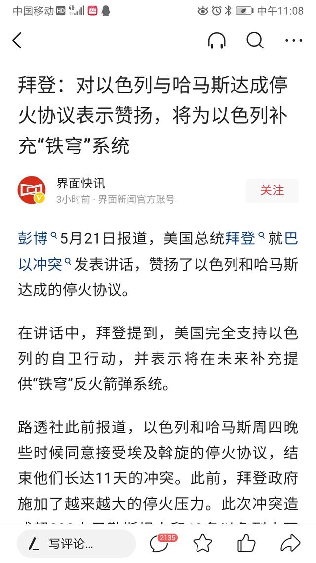 拜登说的很清楚,支持停火,并且立刻给以色列提供“铁穹”防空导弹。这次战争不是大规模全面战争,消耗自然小的多。例如战机消耗就近乎没有。即使如此,为了打击哈马斯的火箭弹,以色列也应该消耗光了自己的铁穹防空导弹。如果哈马斯真的还有800—1000枚火箭弹。那么再打下去,失去了“铁穹”防空导弹保护的以色列伤亡会大大增加。
