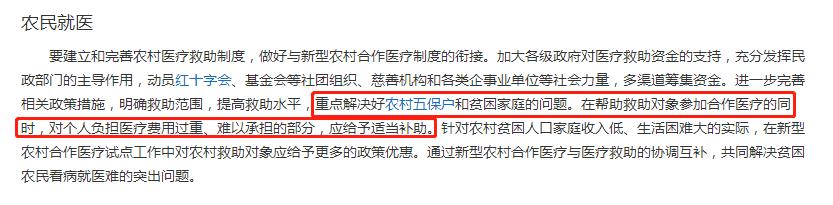 根据2006年国家七部门联合下发的《关于加快推进新型农村合作医疗试点工作的通知》中的相关要求,在其中的农民就医内容中特别提到:重点解决好农村五保户和贫困家庭的问题。在帮助救助对象参加合作医疗的同时,对个人负担医疗费用过重、难以承担的部分,应给予适当补助。针对农村贫困人口家庭收入低、生活困难大的实际,在新型农村合作医疗试点工作中对农村救助对象应给予更多的政策优惠。