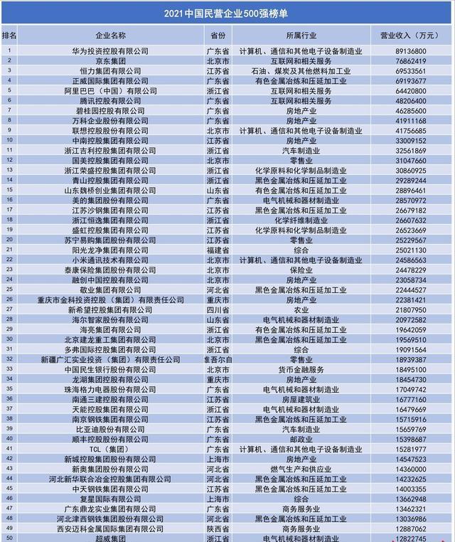 根据今年公布的2021中国民营企业500强的榜单来看,排名第一的是华为,而且这也是华为连续六年位居榜首,京东和恒力位列第二三位。