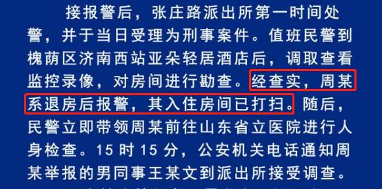 证据难搜集根据警方的通报,女员工周某是在退房之后报警,其入住过的房间已经被打扫,这也是最为关键的地方。因为关于这个案件的所有物证基本已经无从侦查及取证。