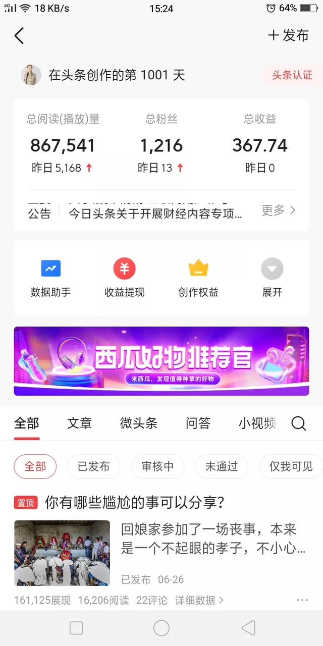 说实话一路走来真不容易,刚开始为100粉丝难为的不轻。因为没过百粉,我做问答,发头条都没有收益。