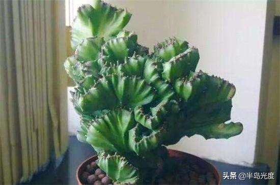 玉麒麟是大戟科大戟属的多肉植物,又叫麒麟角,原产地为印度东部地区,其高度肉质的茎秆通常呈鸡冠状或者扁平扇形,顶端长有长匙形叶片,并带有少量较细的黑色短刺,全株颜色呈绿色或者深绿色,其汁液为乳白色,含有剧毒,如果误食的话可造成严重中毒,而溅入眼中则可导致失明,所以平常养护的时候一定要注意安全,不可随意掰折其茎秆。