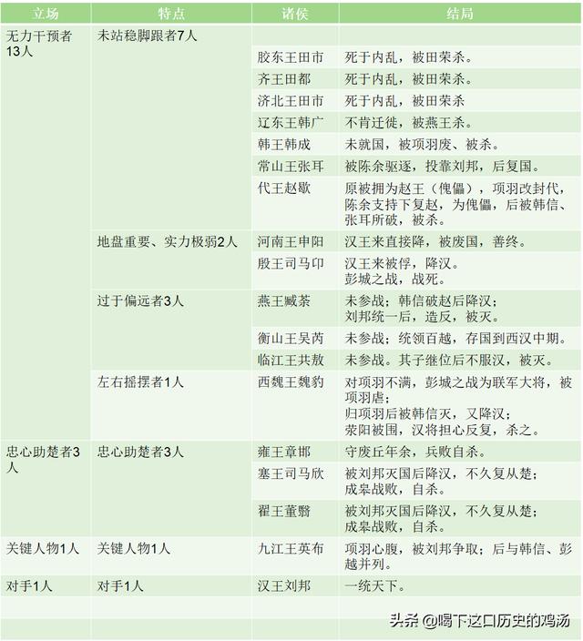 1、根本不可能影响楚汉之争的有13个:其中,在本国没有站住脚的有7位;实力太弱无力抵抗的有2位;地处偏远的有3位;反复跳槽反复被虐的有1位。