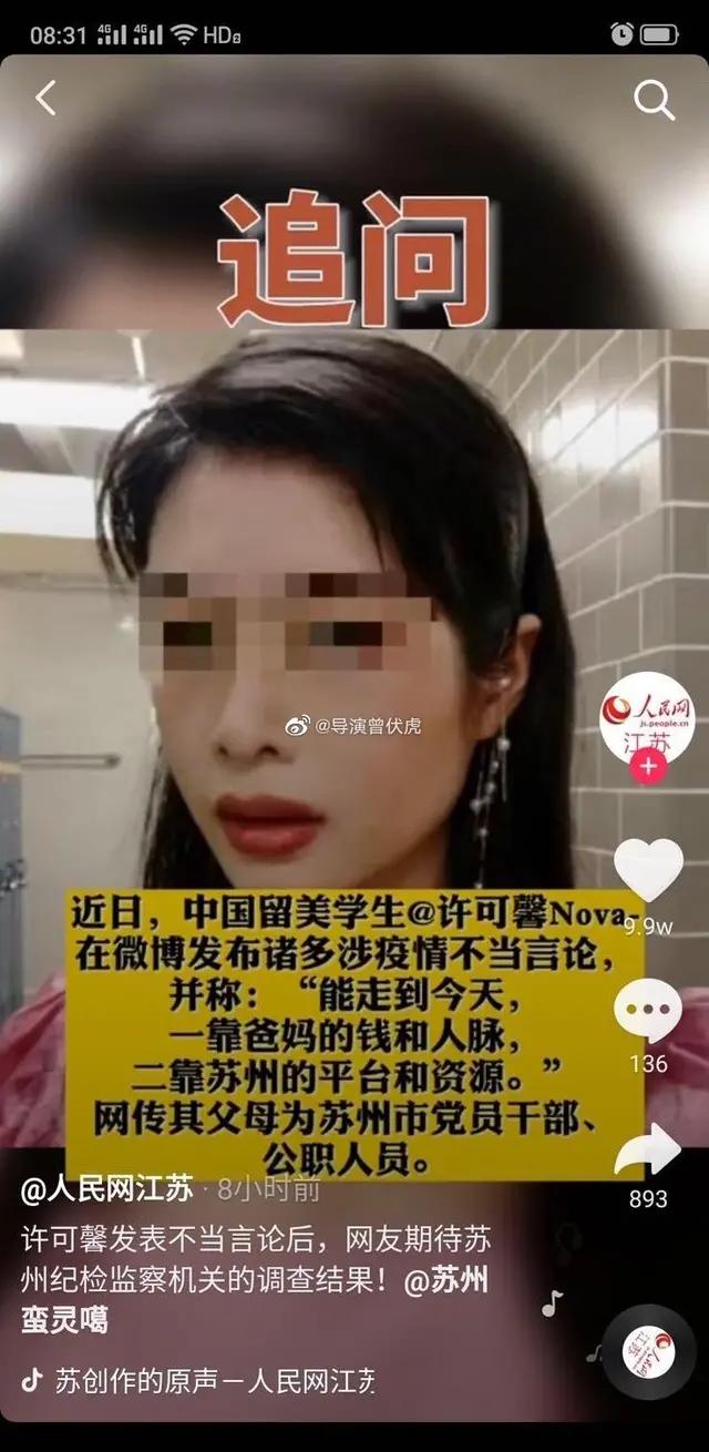 从目前已知的消息来看,许可馨是自己出钱留学的,而且他的父亲是苏州的公务员,他的母亲也是学校的主要领导,我个人觉得在这一个背后是否有更庞大的关系网了,纪检委可以深入的调查一下!许可馨是一个中国人,他的内心应该是喜欢这个国家的,而不应该发表如此不当言论,我觉得他应该对中国人民道歉!