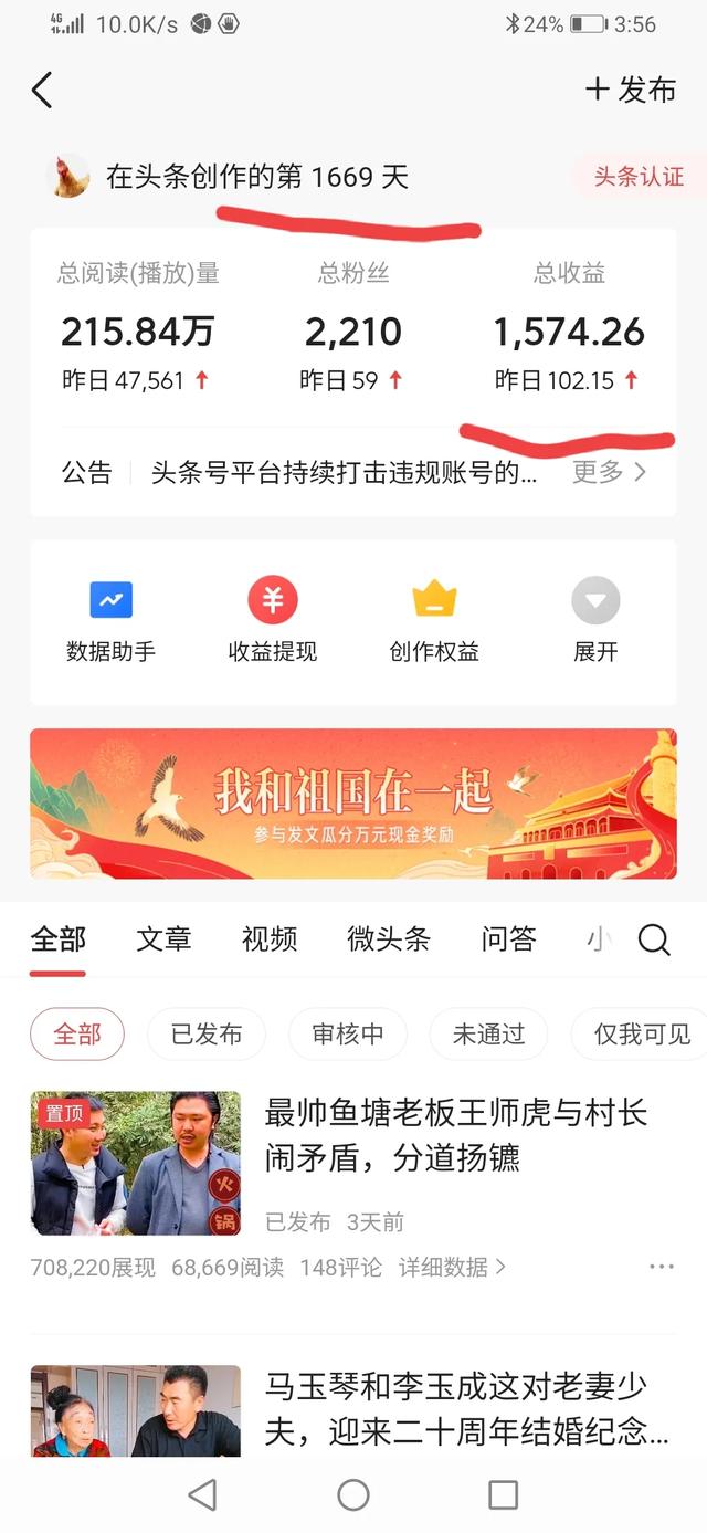 比如有微头条:数字少低到十个字到二千子以内都可以发,配上图片。微头条好处是展现量非常惊人,你有可能在五分钟时间写好一个微头条,发上去上百万阅读都有可能的。有写就有希望没有写没有付出肯定是没有希望的。看下面图片在9月24这天我的一天收入是348块钱就是写了一篇微头条,拍了六七张图片。写了一百个字左右。《马玉琴和李玉成结婚二十周年纪念日》。展现量达到500多万,阅读量50万的微头条直接收入300多块钱。写文章,文章有一定的数字要求,达到300以上配上图片方可发布。写文章就要有一定的新怡了,特别是文章的标题,标题是文章的核武器写好标题就等于成功了一半了。