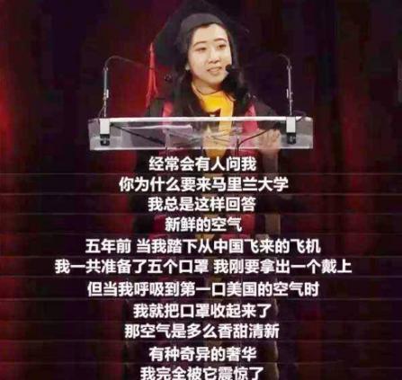 2017年,美国马里兰大学毕业典礼上,一位叫作杨舒平的24岁中国女孩代表国内留学生发表了上述此番演讲的原话。