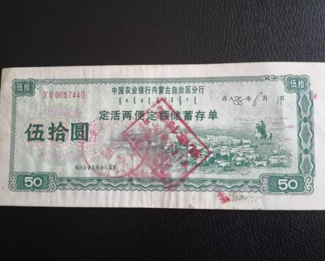 农业银行定活两便伍拾圆的存取凭证这种定期的存取凭证也是我国的一种票张,也算是一种特殊产物吧,毕竟当时的时代可能需要这个东西, 在加上国家的研究,认为这个东西可以推行,所以才在全国各地开展开来,题主的这一张是中国农业银行在内蒙古自治区发行的一种面值为伍拾元的凭证,这张凭证看票面的戳,应该是已经兑换过的,所以这种东西实际的价值并不大,可能当年也是取玩了之后,为了留一个想念,所以找银行人员要了回来,留作纪念,当时的管理其实并不太严格,所以这东西也被放出来了,当然也有可能是人家觉着这东西也没有什么价值了,所以就随手丢弃,被人检出的,总之这种东西按照规定应该是留在银行统一销毁或者封存的,并不能流出来!