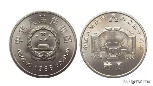 中国人民银行成立四十周年普通金属材质流通纪念币,钱币收藏界俗称‘建行币’,由我国央行(即中国人民银行)发行于1988年12月1日,材质为铜镍合金。一套一枚,面值为一元人民币。