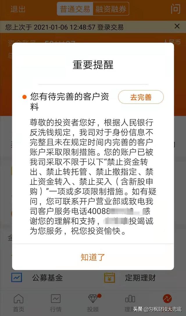 2.在最近三年,为了反洗钱管理规定的有效落实。证券公司都需要针对客户补充各项个人信息,并且要求做一次有效的风险评估测试。如果用户在此期间没有完成,那么账户都会被限制交易。但是这样的限制交易主要是指资金的转出,并不影响证券买卖操作。