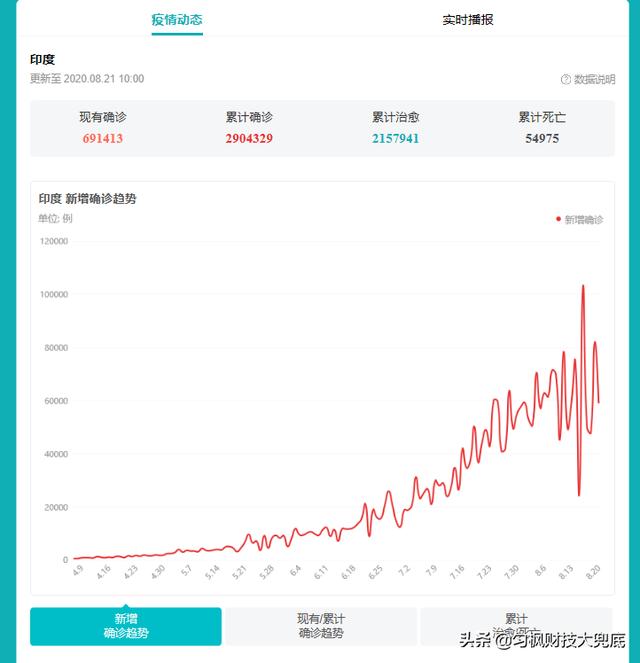 当前印度疫情根据印度新增确诊趋势图我们可以看到,印度当前每日新增确诊极不稳定,最近一段时间新增确诊病例最少的是8月15日,新增24,696例。