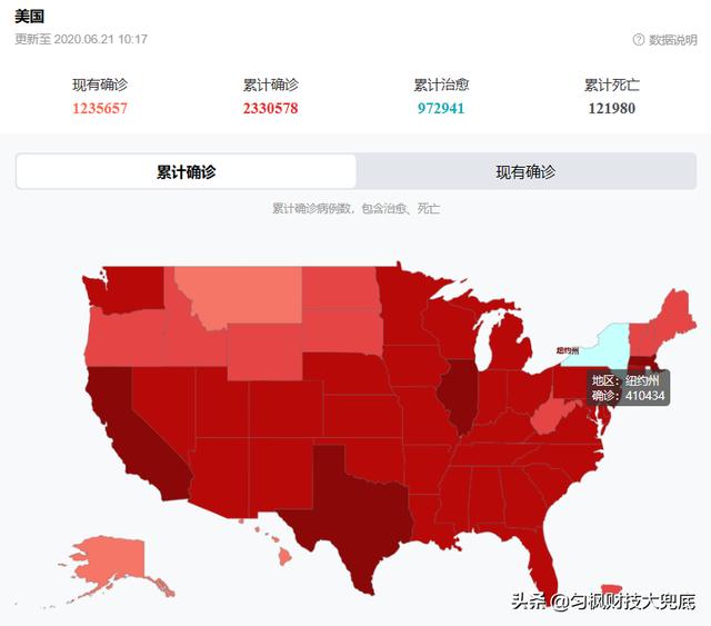 我们重点看一下美国的情况,美国累计确诊病例已经达到了2,297,190人,累计治愈人数95,661人,现在仍然有确诊病例1,219,722人,累计已经死亡人数121,407人,昨日新增确诊病例34,847人,昨日治愈人数28,626人,昨日新增死亡人数817人。