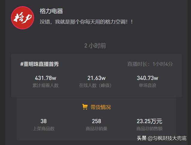 1.在4月24日的晚上8点,董明珠首次出现在抖音直播间。打的噱头是代货首秀,但其实更多的是企业产品展示和企业品牌宣传,同时为格力抖音号吸粉。情况下醉翁之意不在酒嘛,那么直接销售额不会太高的,最后收场时销售额仅有23.25万元。对于一个直播新人来说,帮企业的抖音号将粉丝吸上来,未来慢慢干才是重要的。