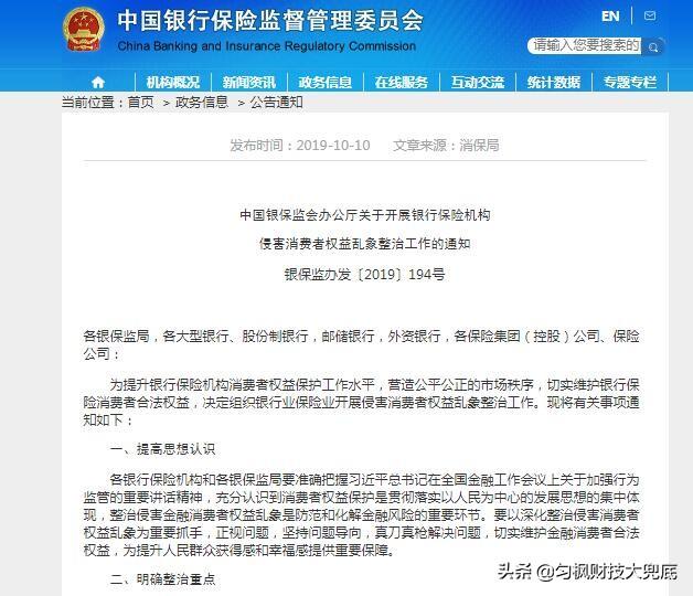 在2019年银保监会发放的194号文中,针对银行业侵犯消费者权益乱象,其中第三大点“产品销售方面”中的第五项明确指出: