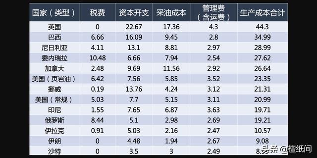 世界各产油国的成本差异非常大,看一下主要产油国的成本