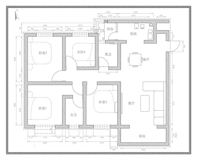 今天尝试一下这四室的户型,大致看了看,需要优化的地方不多,主题都是围绕厨房,客餐厅有一点小建议。题主这户型使用面及差不多85㎡,这户型不错,如果客卫能和主卫调换面积就完美了。下面开始优化改造方案,原户型图式如下▼