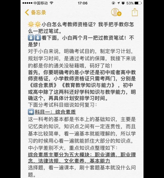 先来综合素质哈,因为这科是最简单的,把三观(教师观、学生观、教育观)、三爱两人一终身的知识点一定要背年年考!知识点记住之后就可以直接开始刷题了,我当时是下载的一起考教师app,上边的题库比较大,而且在刷题的过程中你就会发现有些题真的就是不用看书你也会的类型。最后就是作文,作文分数50分,基本上拿下这一科就不用看了,我就是在考前看了两篇范文然后自己试着写了写,告诉你个小技巧哦,围绕着教育然后一教师的角度去写拿高分肯定没有问题的。