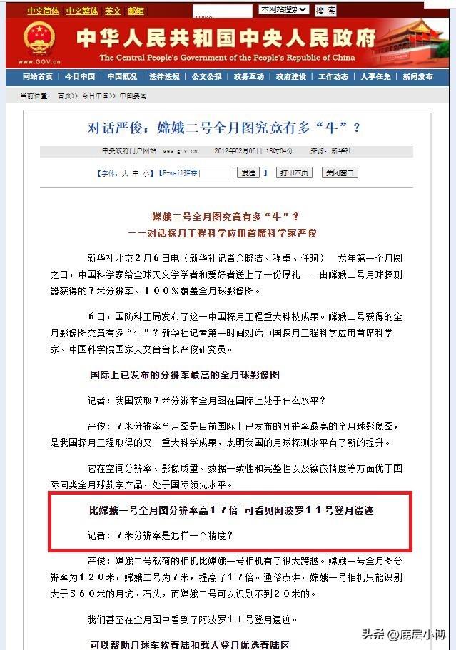 (1)中华人民共和国中央人民政府网曾在2012年介绍嫦娥2号全月图时,引用了中国探月工程科学应用首席科学家、中国科学院国家天文台台长严俊研究员的一句话“我们甚至在全月图中看到了阿波罗11号登月遗迹” 。政府网上发布该新闻基本是承认美国登月的。 http://www.gov.cn/jrzg/2012-02/06/content_2059665.htm